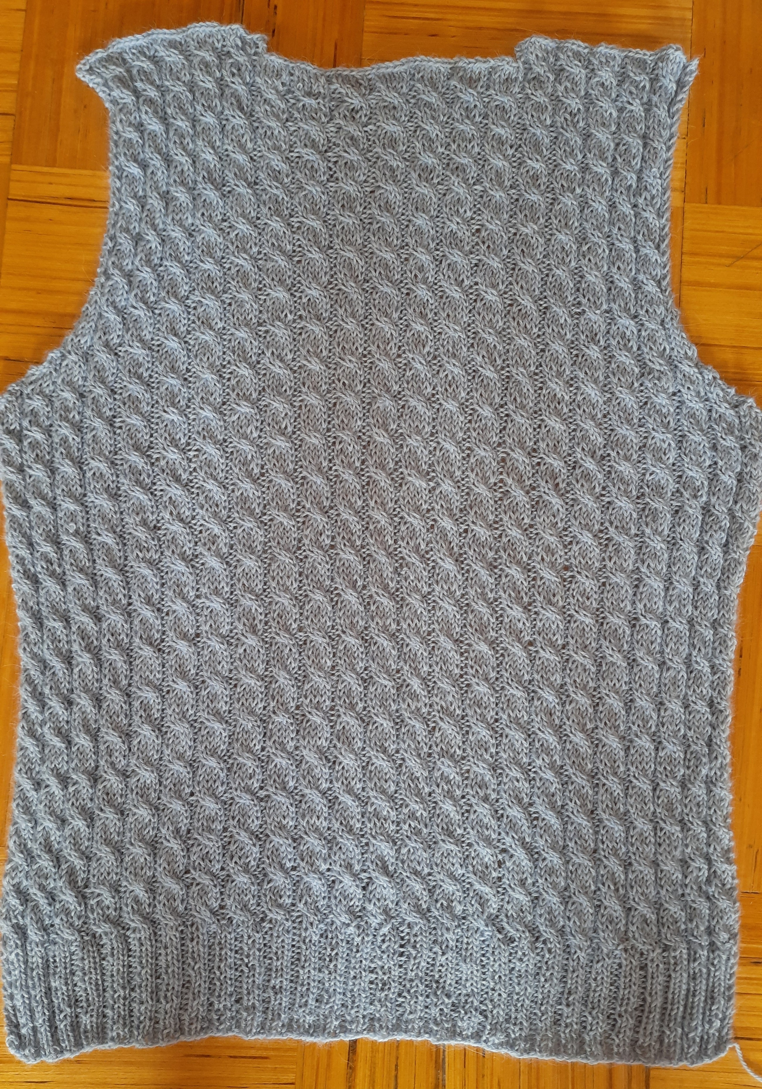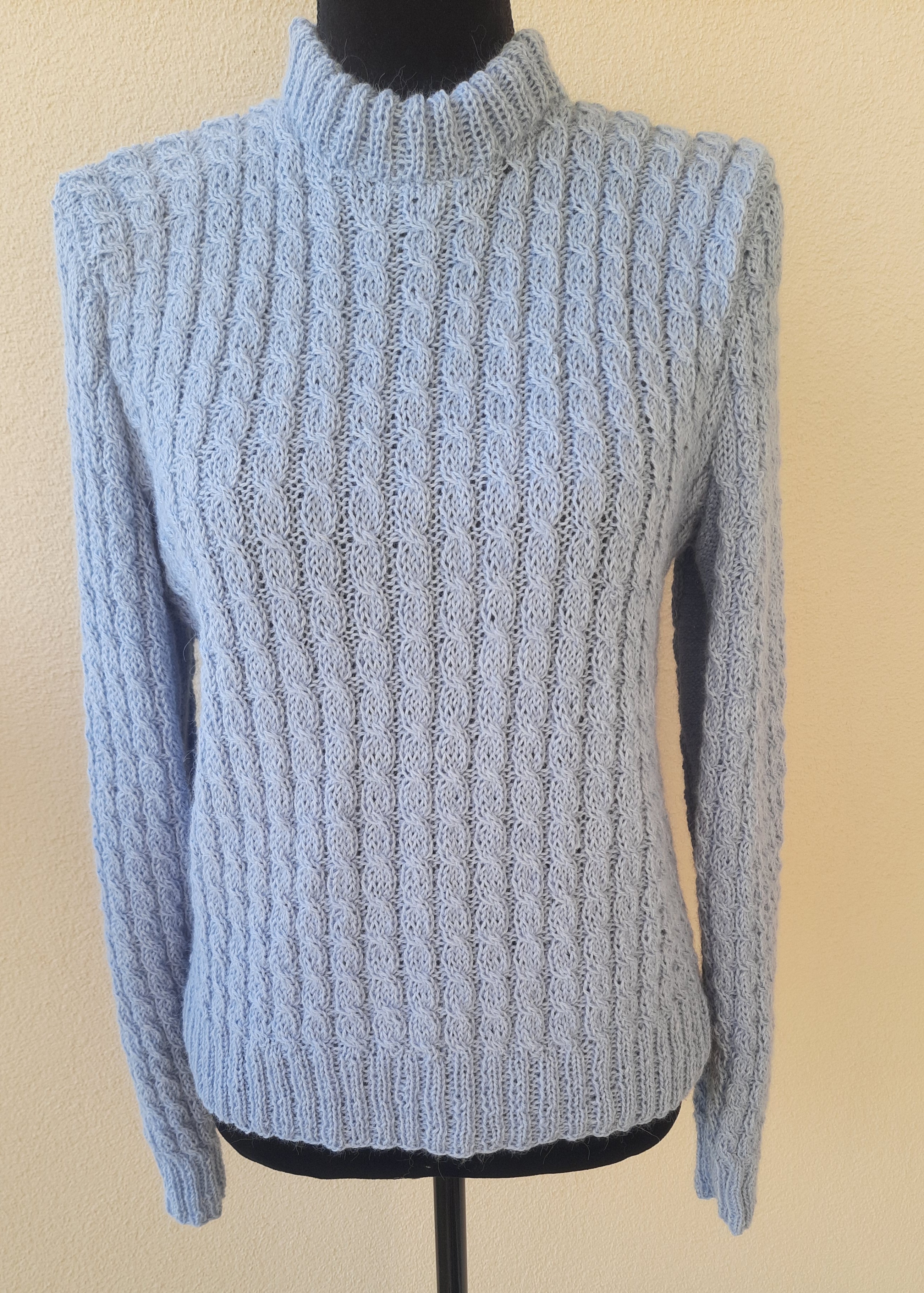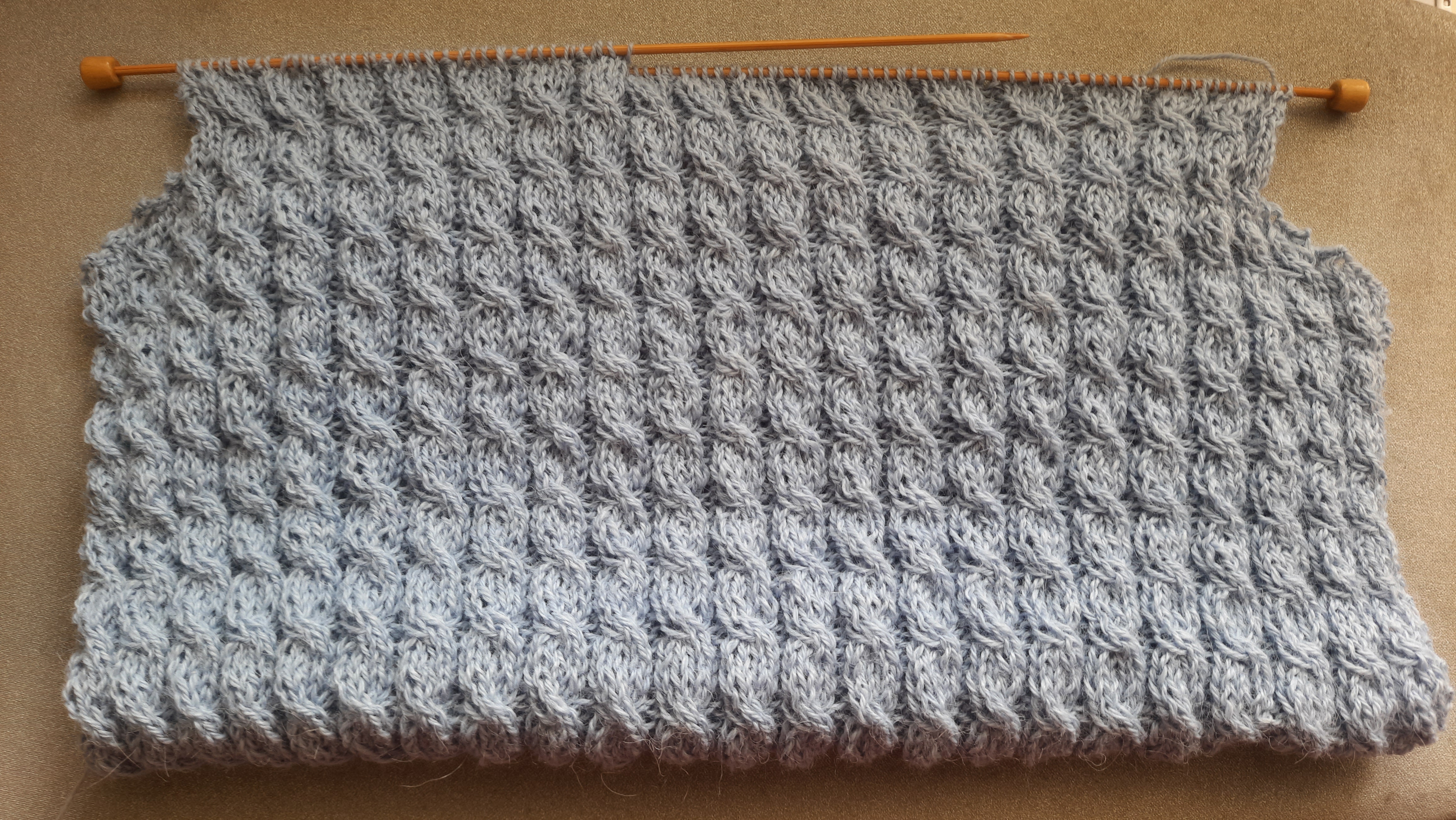 Selle kampsuni kudumise tõuke andis üks linnaliinibussis istuv proua, kes kandis helesinist palmikutega kampsunit. Tema kampsun oli puuvillane ja arvatavasti masinaga kootud. Mina külmavaresena otsustasin alpakavillase lõnga kasuks.