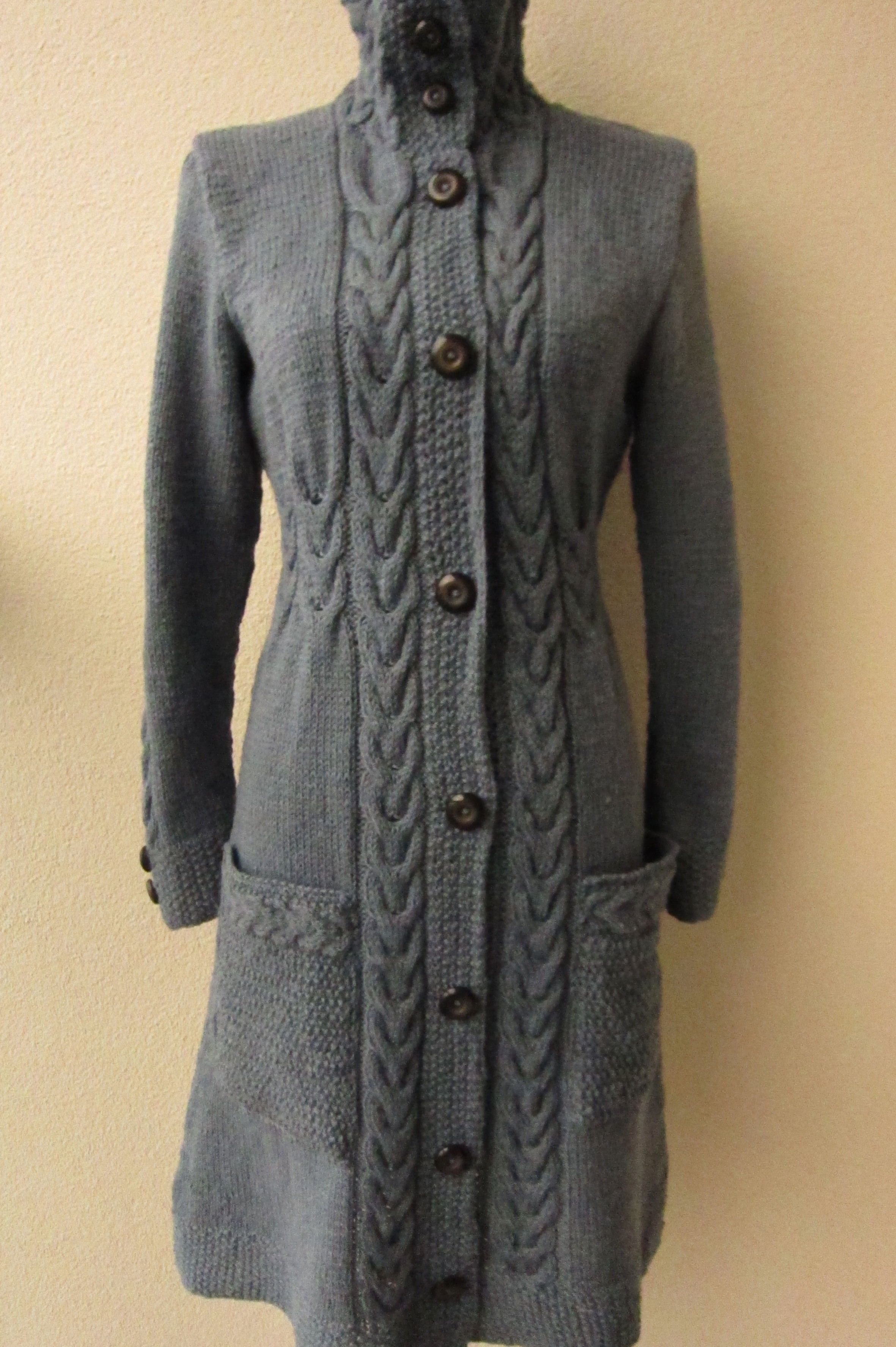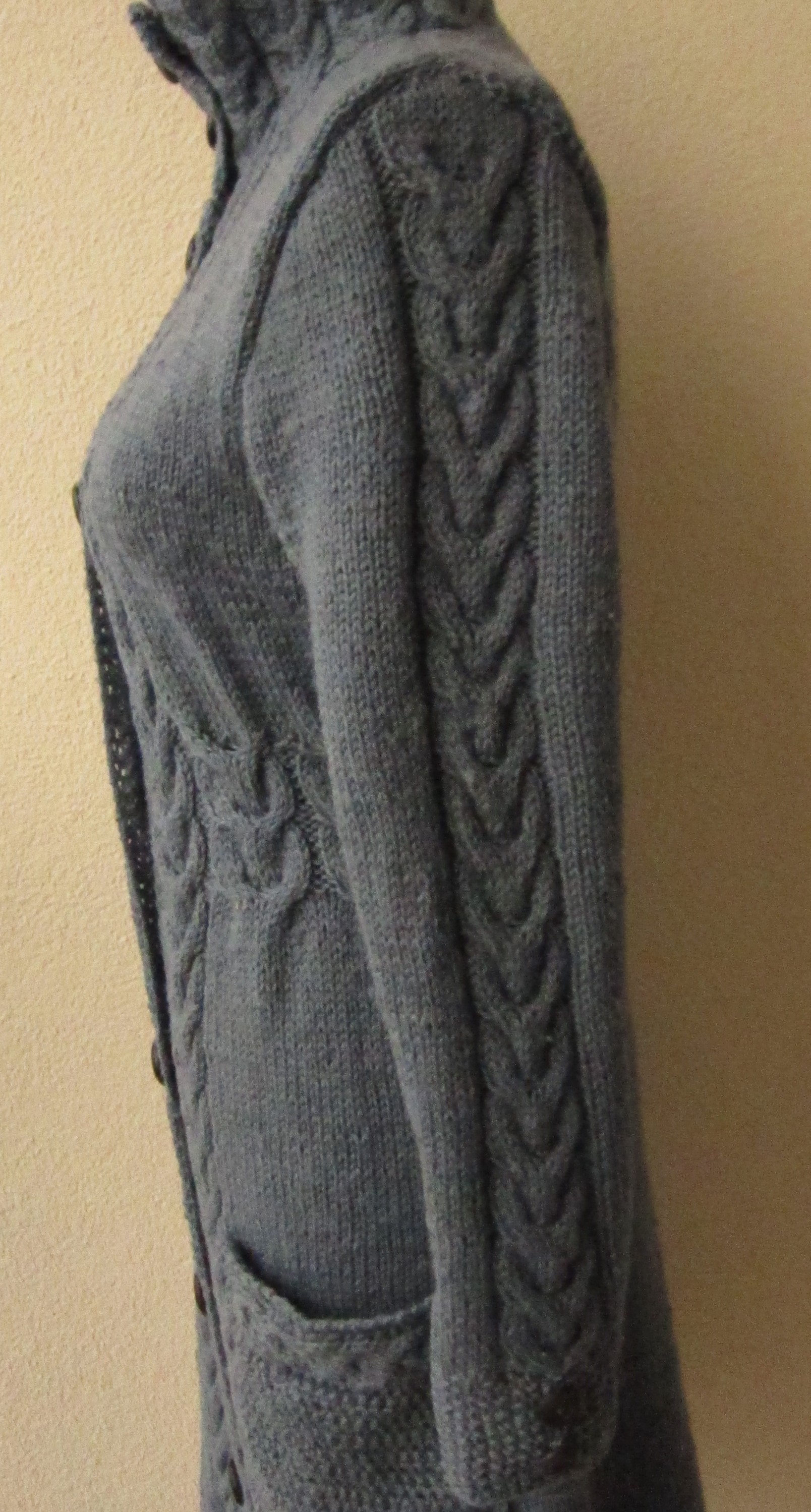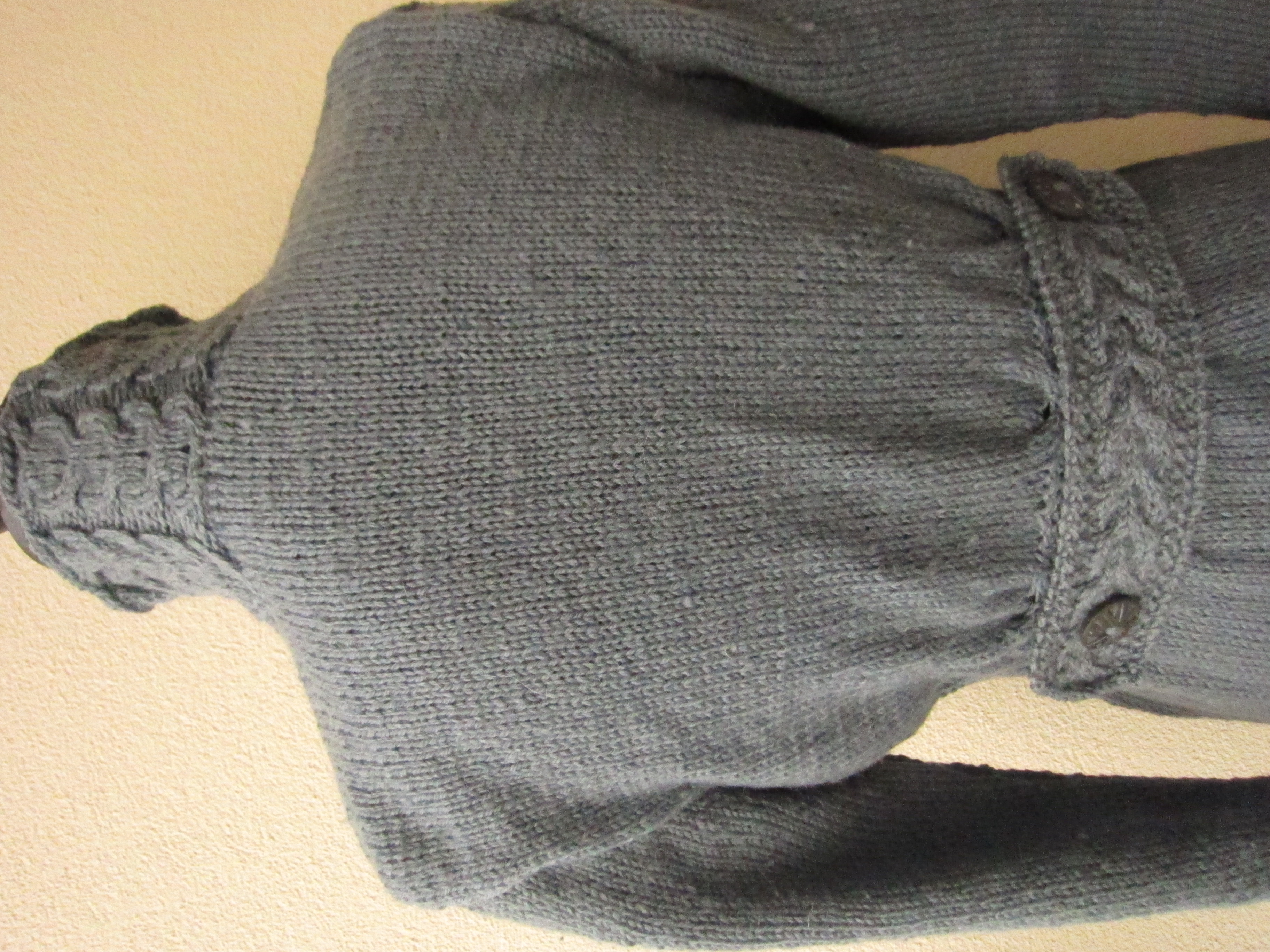 Monikal oli plaan talle jäänud lõngast üks pikem kampsun saada. Põletusprooviga tundus lõng olevat villane, aga kududes pestes tundus mulle, et see on ehk villasegu. Lõng oli pisut paksem, kui tavaline villane, kudusin seda varrastega nr 3,5. Pikale kampsunile kulus üsna vähe lõnga, umbes 675g. Kampsun tuli suurusele S ning pikkuseks sai peaaegu meeter.