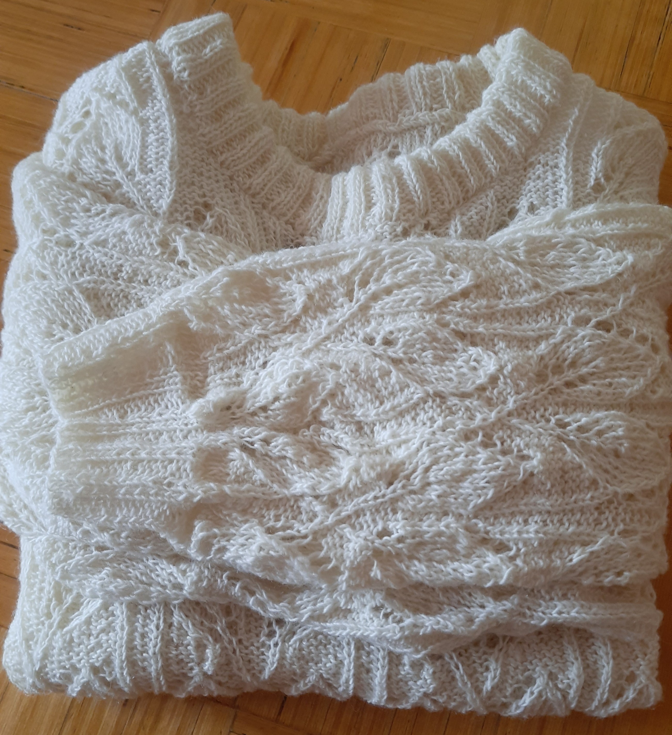 Taheti nn oversize kampsunit, kehaosa laius sai umbes 60cm ja pikkus 64cm, varrukad said tehtud ka üsna laiad, ülalt kusagil 25 cm. Kuna ma ei teadnud, kuidas lõng täpselt käitub, siis kudusin ja pesin detailid eraldi ja pärast õmblesin kokku.